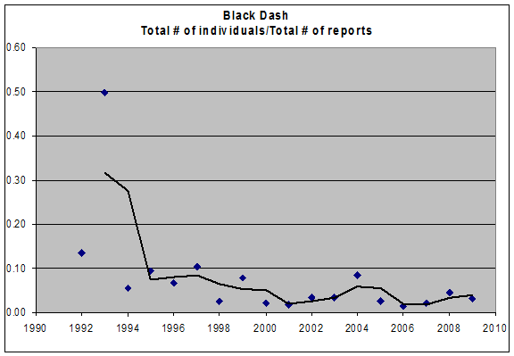 MBC yearly records of sightings per number of trip reports show a trend toward decline in this species (Chart 105). The reading for 1993 is especially high owing to an unusually large number (212) reported from one site in Easton. (In all other years the largest number from any one site or even from a NABA Count does not exceed 30.) Even if that report is left aside, there is still a downward slide in sightings over this time period. Moreover, list-length analysis of these same 1992-2010 data showed a statistically significant 61.6% decline in Black Dash over these years (Breed/Stichter/Crone 2012). Mulberry Wing also showed a significant (39.9%) decline.
