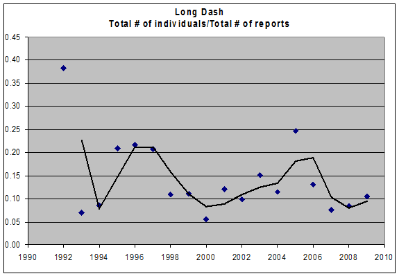 Chart 95, showing numbers seen per total trip reports by year, suggests that there has been some decline in this species over the 1992-2009 period. Particularly good years for Long Dash, in relative terms, were 1992 and 2005, although 1992 is somewhat less comparable due to the smaller number of trip reports that year. The picture of decline rests partly on some especially large reports from 1992. But even if this is disregarded, the years 2007-2009 are still low in relation to the highs of 1995-1997 and 2005.