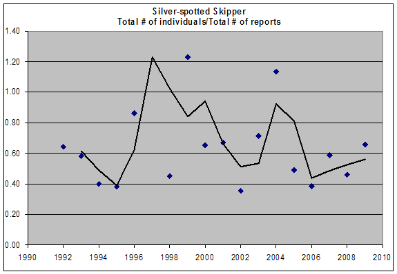 In 1999 unusually large numbers were reported from the Northern Worcester and Central Franklin NABA Counts (506 and 422, respectively), but there were also large numbers reported from other locations that year, and it was a banner year overall for many duskywings and large skippers. The year 2004 again saw especially large numbers from Northern Worcester NABA (404), and from Central Franklin NABA (115); both these counts periodically report triple-digit numbers of Silver-spotted Skippers.