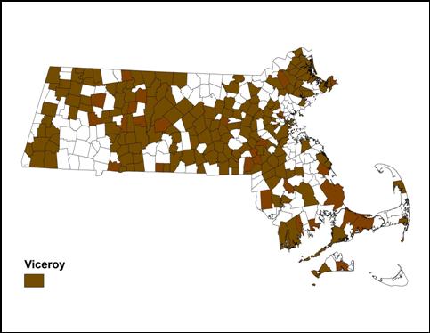 Viceroy is found throughout the state (Map 60). It has been found in 186 out of a possible 351 towns. It is much less frequently found on Cape Cod and the islands than inland, but since the 1990's there have been increasing reports from this area.